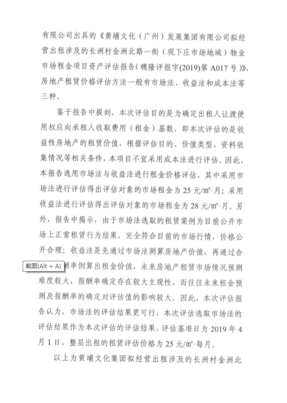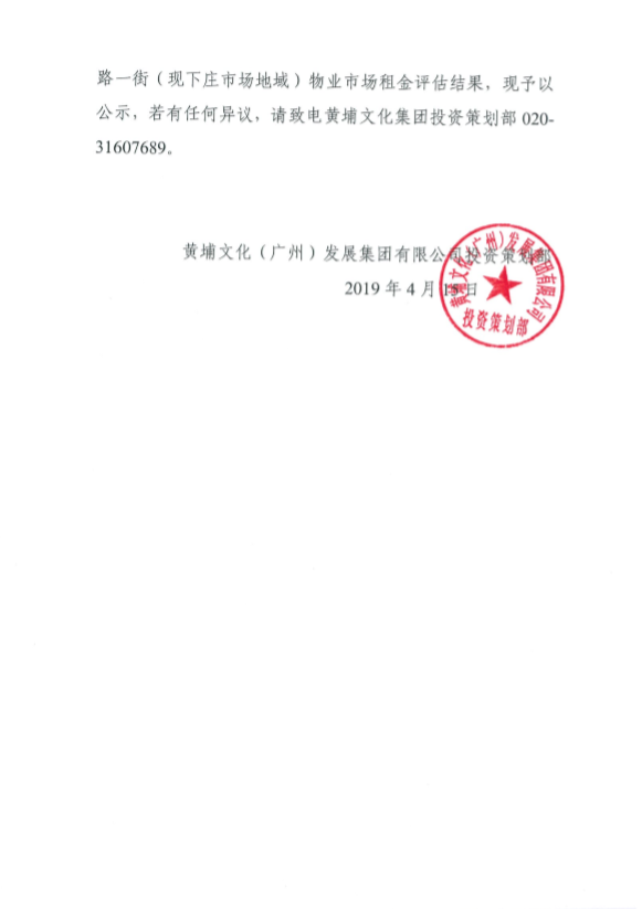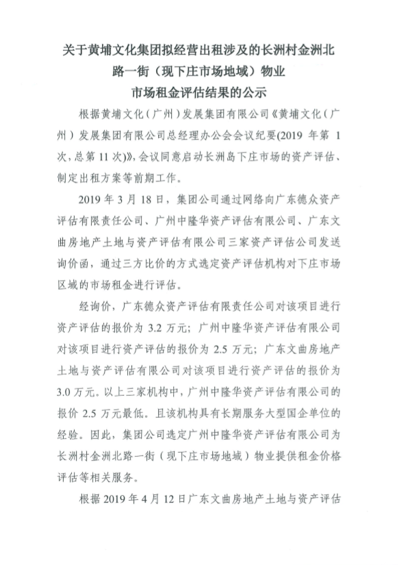 公示:關(guān)于黃埔文化集團(tuán)擬經(jīng)營出租涉及的長洲村金洲北路一街(現(xiàn)下莊市場地域)物業(yè)市場租金評估結(jié)果的公示